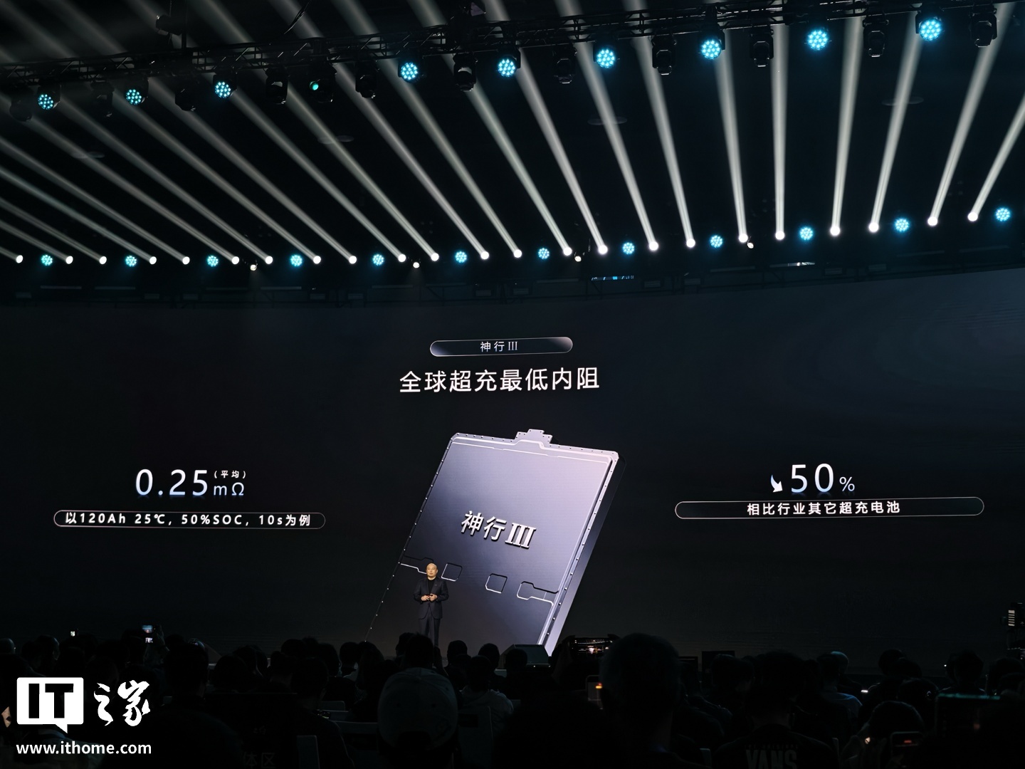 昨晚发布的第三代神行超充电池,据称具备“安心满电 6 分钟”的特性。同时,第三代神行超充电池拥有“全球超充最低内阻”平均 0.25mΩ,相比行业其他超充电池降低 50%。